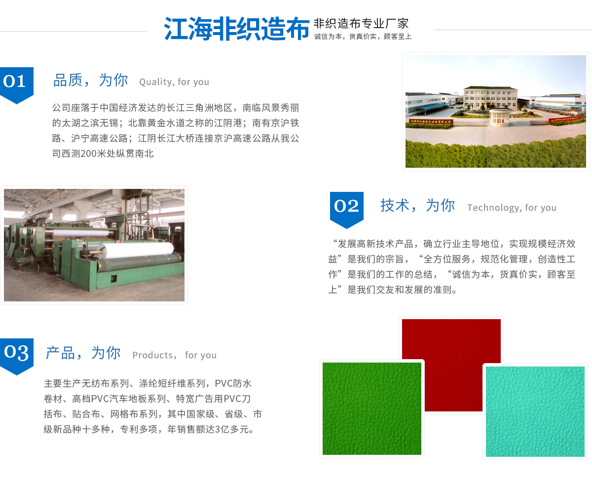 江海企業(yè)有江陰市江海非織造有限公司、江陰市江海防水材料有限公司、江陰市三江寬幅無紡布有限公司、江陰市三江織物涂層新材料有限公司組成,均屬于江蘇省民營科技企業(yè)。企業(yè)現(xiàn)擁有員工近千名,占地15萬平方米,廠房建筑面積達80000多平方米,凈資產(chǎn)超億元,主要生產(chǎn)無紡布系列、滌綸短纖維系列、PVC防水卷材、高檔PVC汽車地板系列、特寬廣告用PVC刀括布、貼合布、網(wǎng)格布系列,其中國家級、省級、市級新產(chǎn)品十多種,專利多項,年銷售額達3億多元。